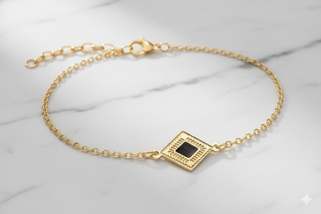 Bracelet en acier inoxydable de qualité, ionisé doré, motif losange avec émail noir