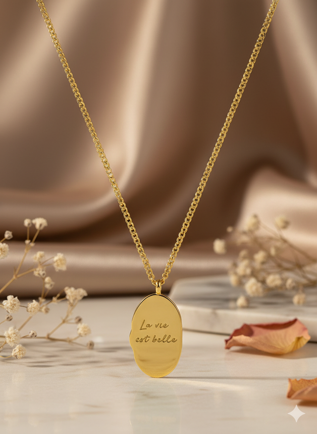 Collier en acier inoxydable de qualité, ionisé doré, recto motif fleur, verso texte gravé "La vie est belle"